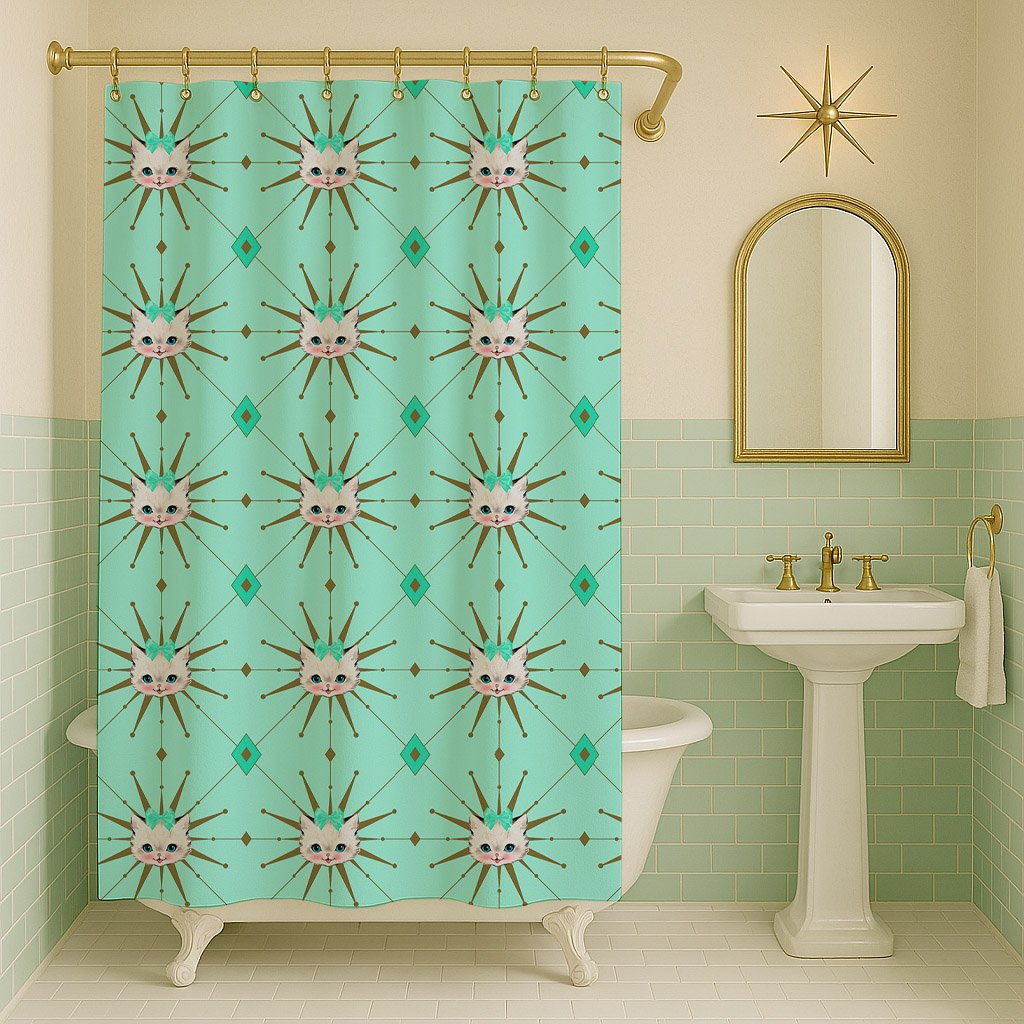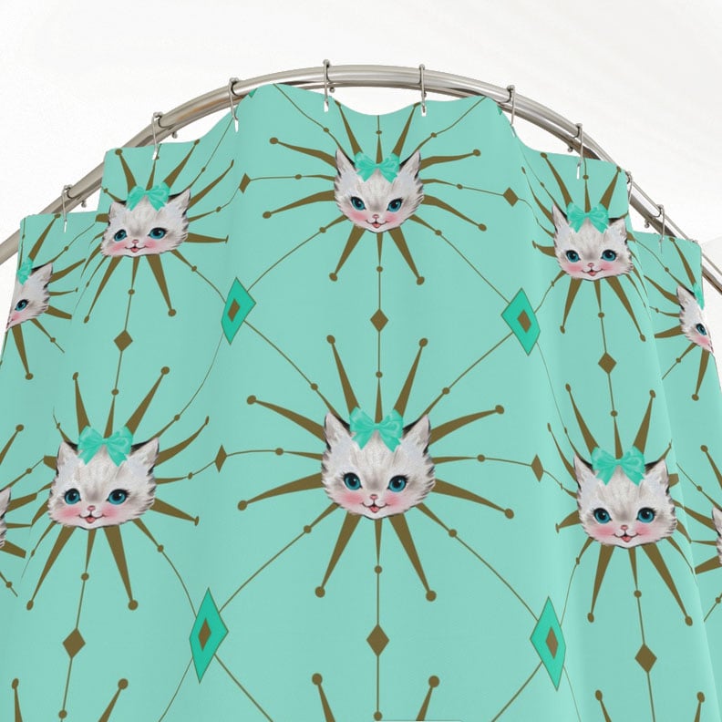 Add a touch of nostalgia to your bathroom with this retro 1950s style shower curtain. An original design from Starlite Drive, it features a cute kitschy kitten and bold atomic starburst & diamond pattern in mint green.