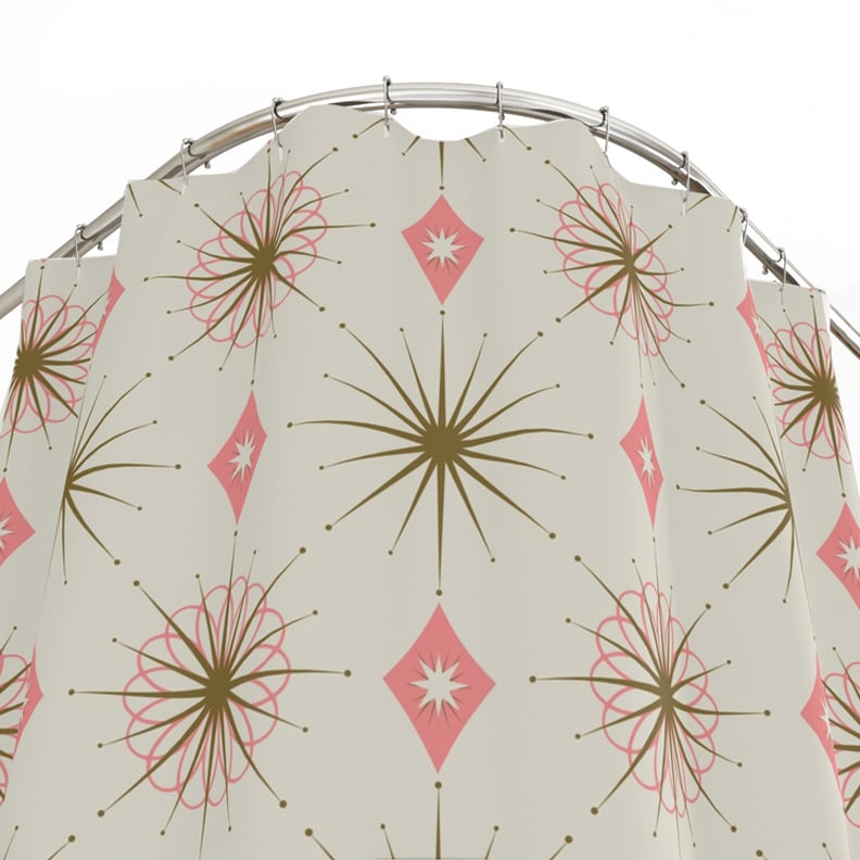 Add a touch of nostalgia to your bathroom with this retro 1950s style shower curtain. Featuring an original design from Starlite Drive, it features a bold atomic starburst and diamond pattern in pink and gold, reminiscent of mid-century decor.