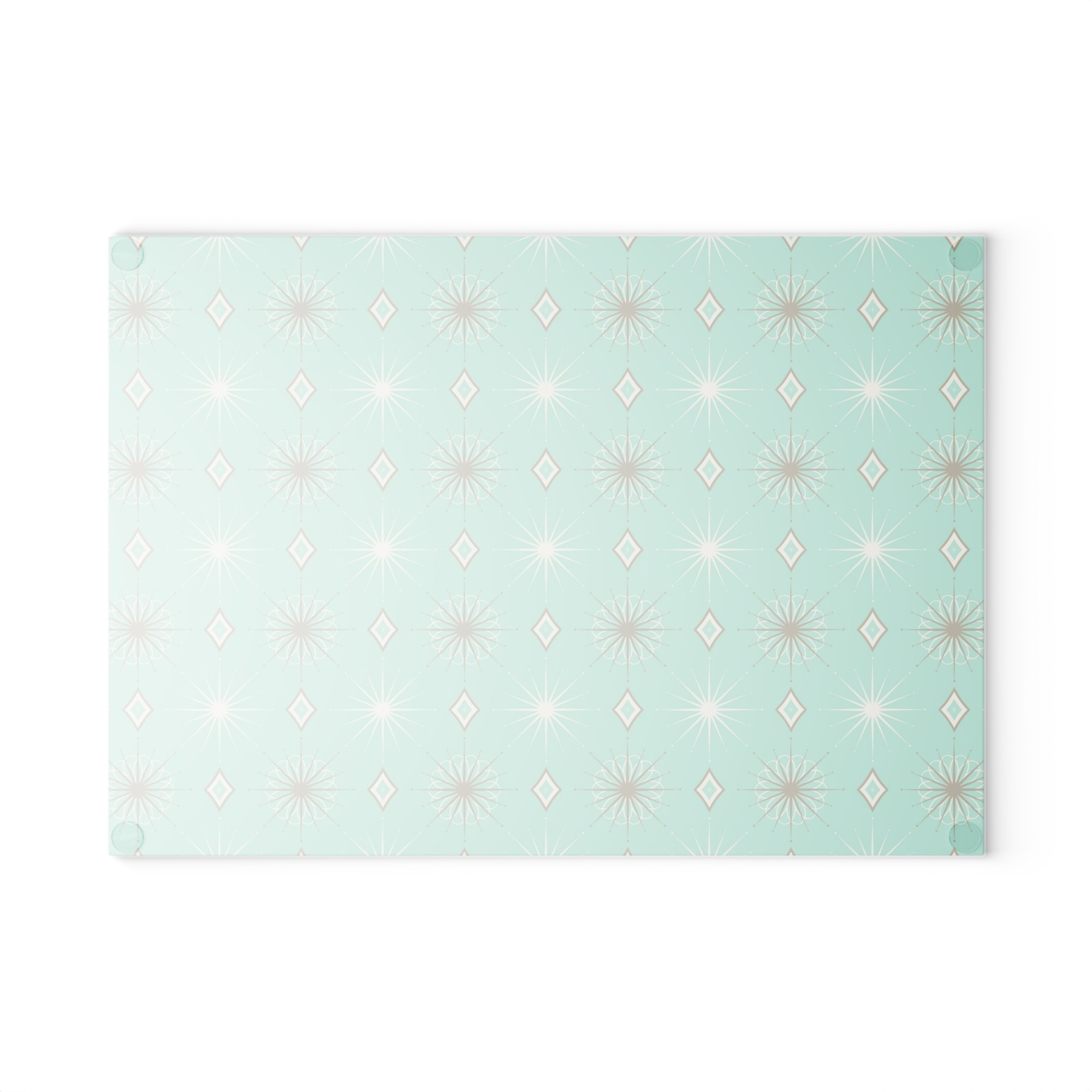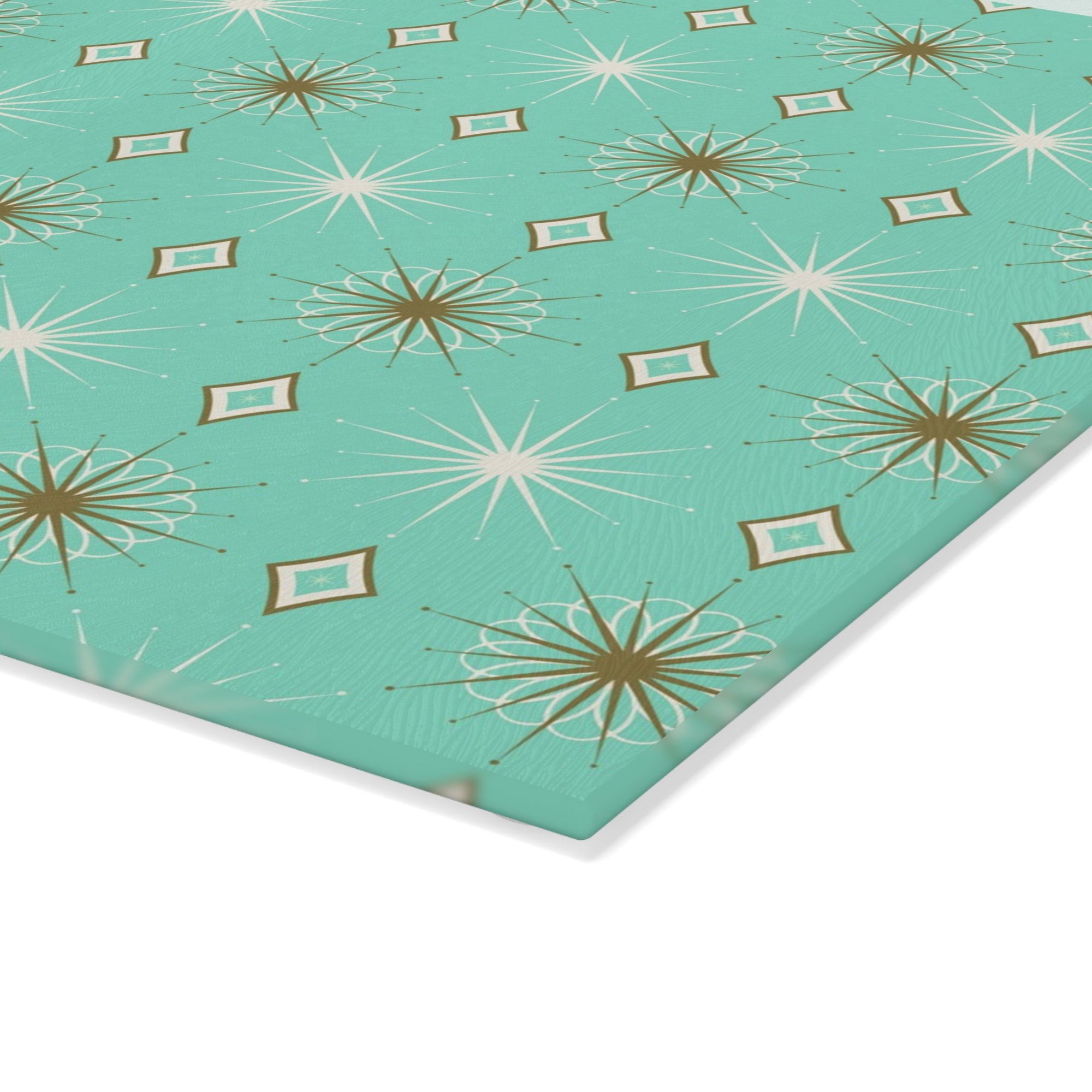 Slice, serve, and sparkle with style! This tempered glass cutting board features the signature Starlite atomic pattern in aqua and gold—straight out of a 1950s kitchen. Scratch-resistant and sturdy under pressure, it’s just the ticket for prepping dinner or jazzing up your counter with a dash of retro flair.