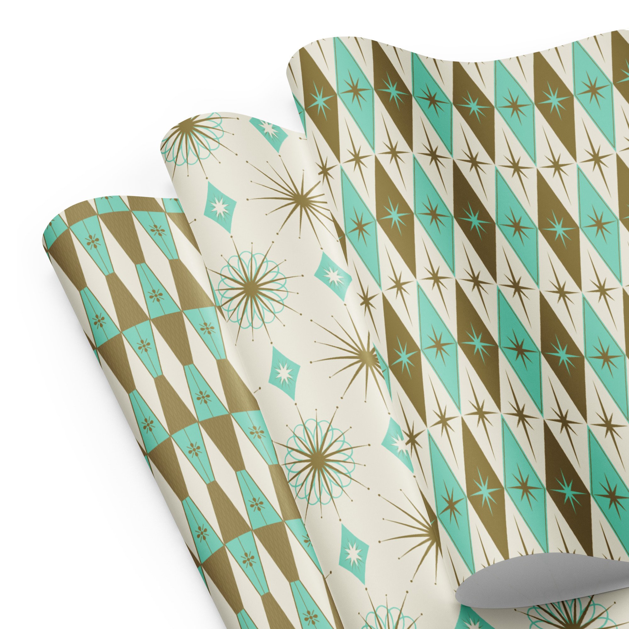 Cool, crisp, and straight from the golden age of gift wrap. This trio of retro designs brings together icy aquas, warm golds, and classic atomic motifs in a palette that feels like a winter cocktail hour under the stars. Featuring sharp harlequin patterns, mid-century bursts, and playful pops of aquarelle blue, it’s the perfect finishing touch for holiday gifts, winter birthdays, or any occasion that calls for a little throwback sparkle.