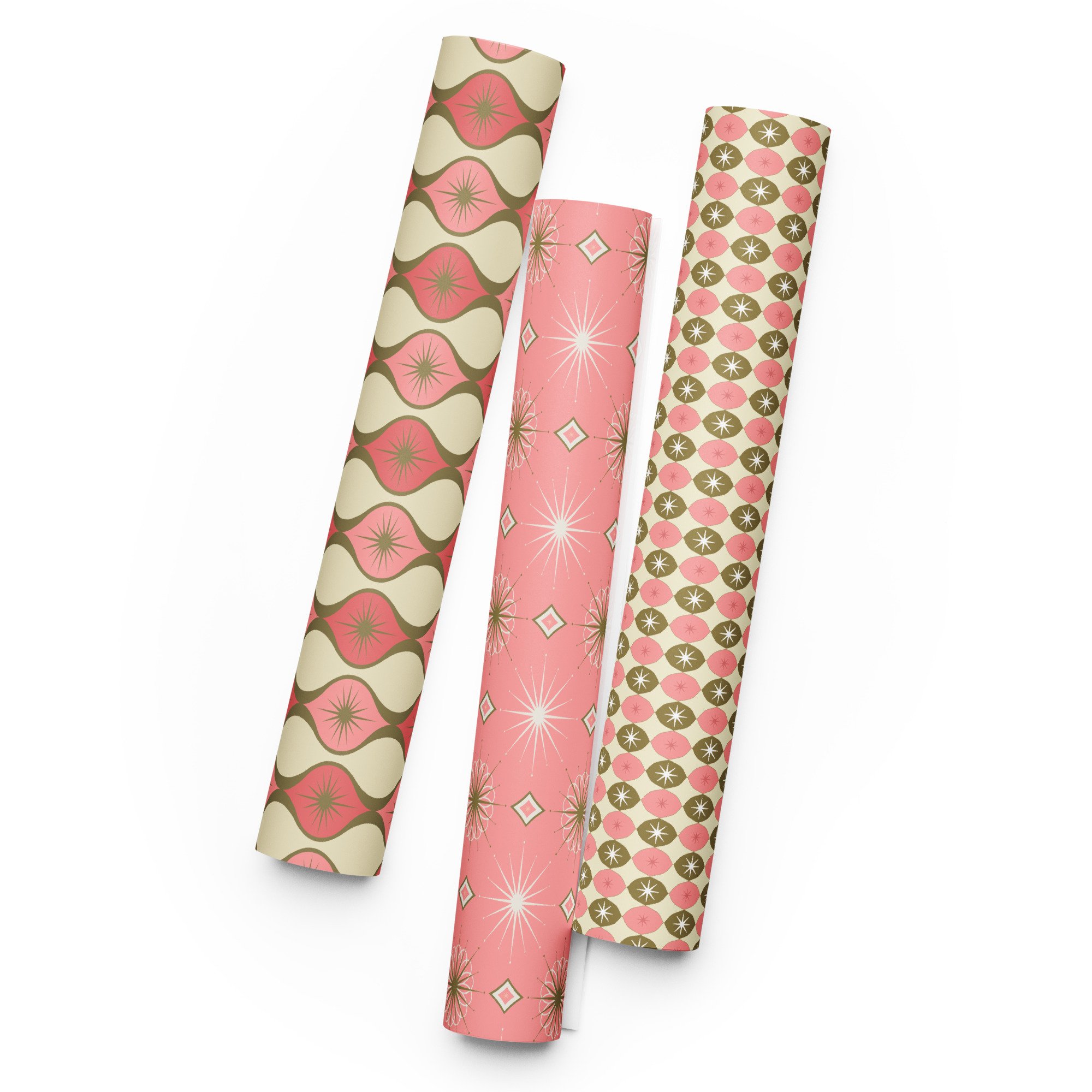 Soft, sweet, and dipped in mid-century style. This trio of retro designs blends warm pinks, soft cream, and vintage gold into a gift wrap set that feels like a cocktail party at sunset. With atomic bursts, swooping shapes, and playful geometric repeats, it’s perfect for birthdays, showers, or any occasion that calls for a little retro polish with a pop of pink.