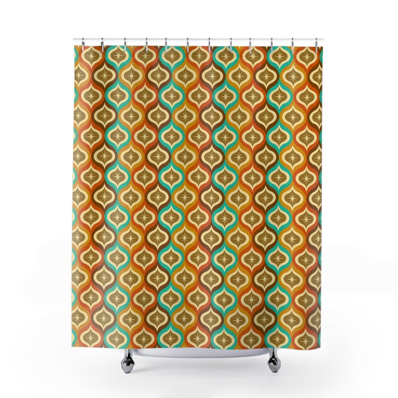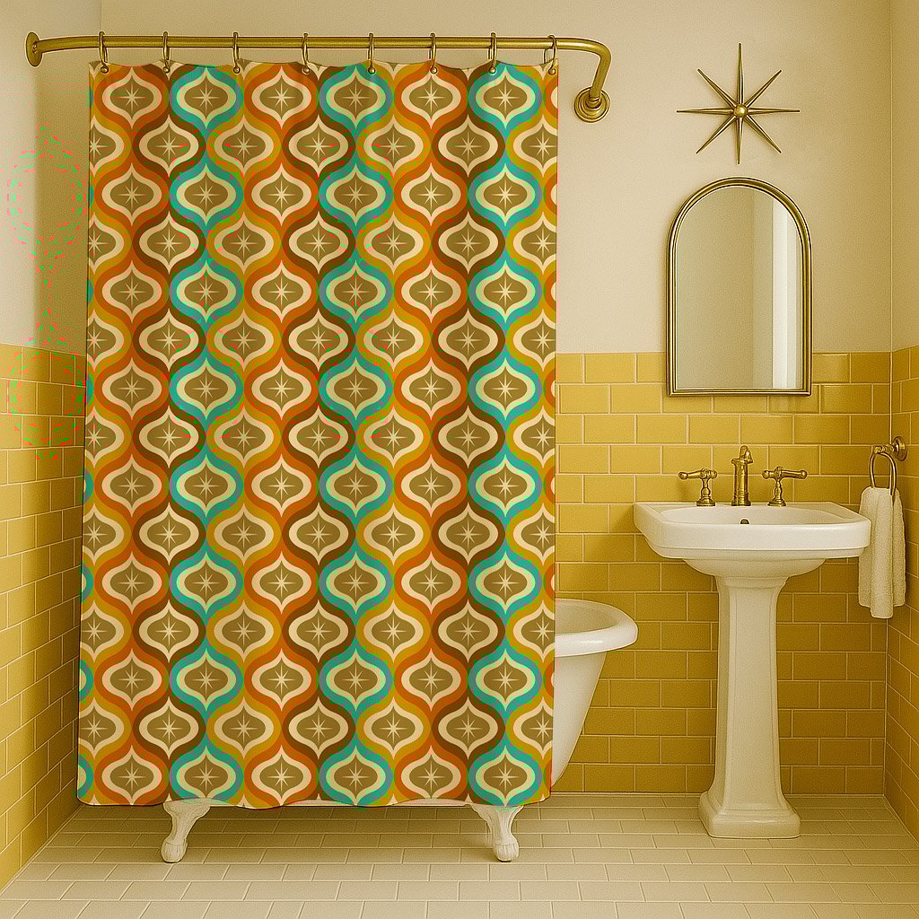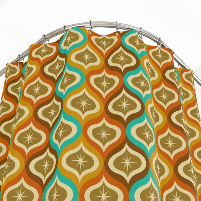Add a touch of nostalgia to your bathroom with this retro 1950s style shower curtain. An original design from Starlite Drive, it features a bold atomic starburst ogee pattern reminiscent of mid-century lounge wallpaper in aquarelle, burnt orange, mustard, chocolate brown & gold.
