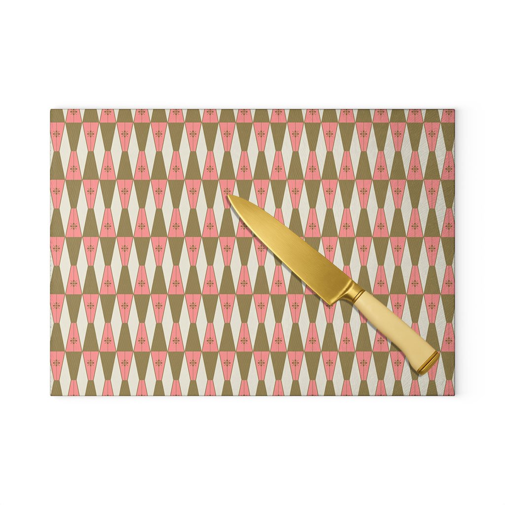 Chop, dice, and dazzle! This tempered glass cutting board features the eye-catching Starlite Pink Lava pattern—bursting with 1950s flair in shades of blush, gold, and cream. Built to handle the heat and add some sizzle to your countertop, it’s as tough as it is terrific.